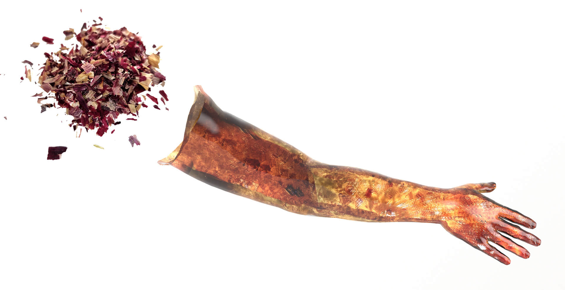 Addressing the report of the UN Environment Programme (UNEP) that an estimated 1.3 billion tonnes of food is discarded each year, Japanese designer Yuki Hadal and Chinese designer Siyuan Wang created SHED. While emphasising the rising implication of food waste as an unsustainable threat for now and the future, the designers created a material out of these wastes. After a tedious process of drying, shredding, and mixing them with agar-agar, glycerine, and water, the food waste is rebirthed as a material that can be used to make gloves, caps, furniture, and other accessories. The new material thus created, named SHED, follows the natural course of time and is embodied in the literal definitions of the word shed: natural fall, leaves, or to change human skin. The designers state that by altering the proportions and the kind of food waste used, SHED can be moulded into sheets that resemble leather, vinyl, and resin, and in a different range of colours.