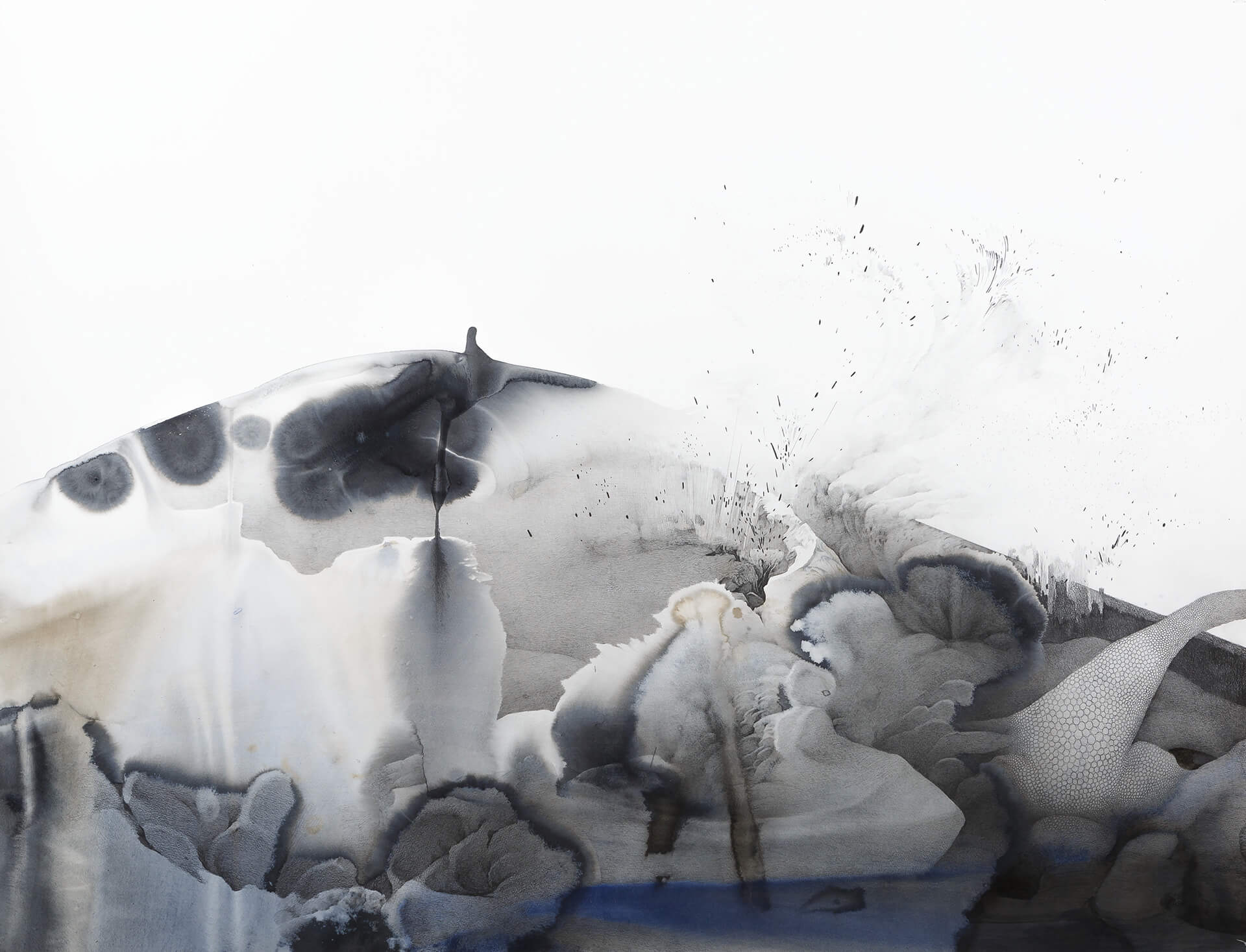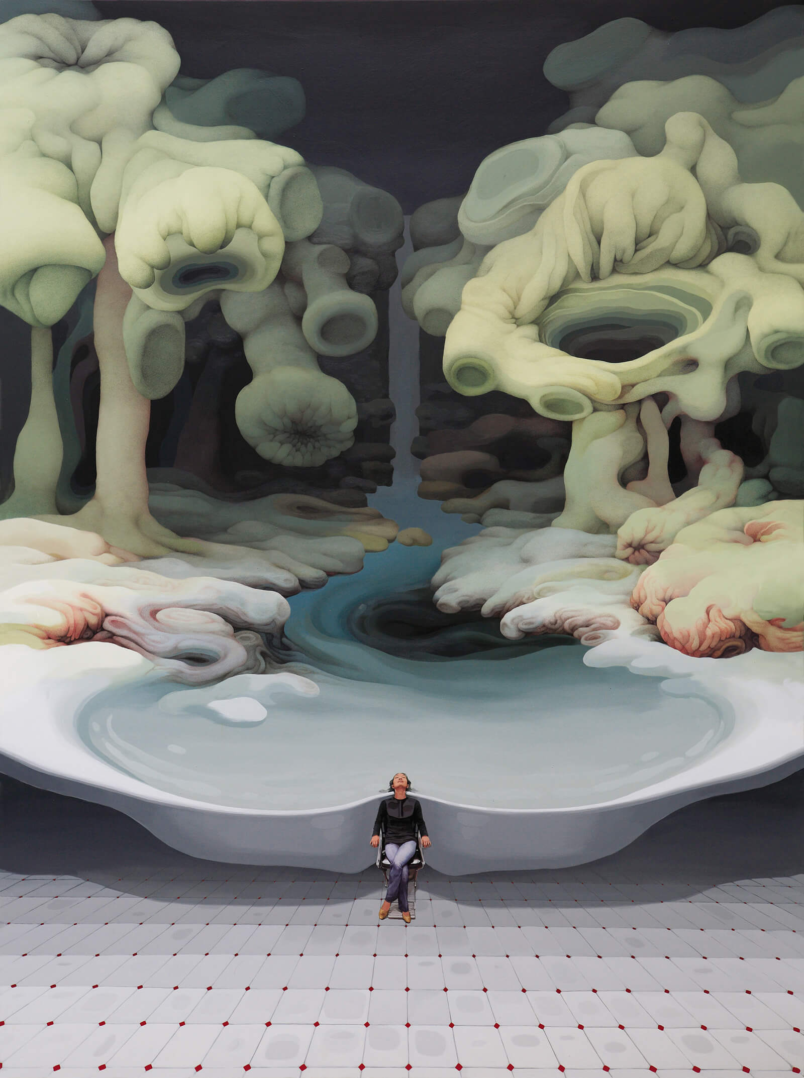 The overflow of the forms and the excessive use of space in the paintings by the Korea-born, France-based artist, Min Jung-Yeon, open a fantastical world that defies the principle of linear perspective. The circular craters and the thick tentacle-shaped figures, ubiquitous in her works, encapsulate her idea of non-confinement in an effort to question the conventions of space and time. Unlike the fleeting appearance of the dreamlike structures, especially in the history of painting, that evoke a sense of disenchantment, Jung-Yeon ensures the viewers are deeply engrossed within the work to open the new possibility based on renewed interest and transformation.