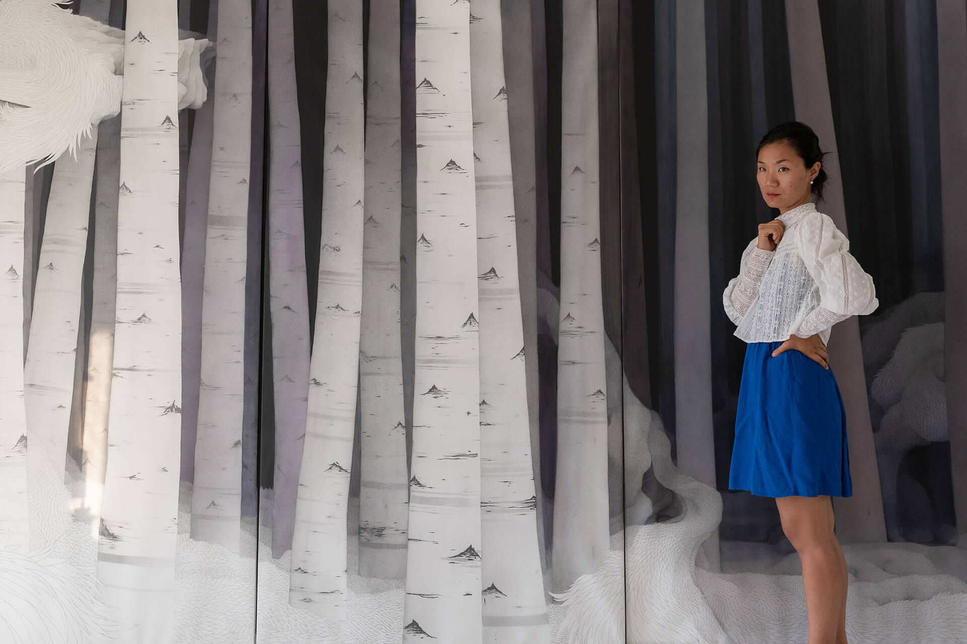 The conceptual depth was made, once again, visible in her latest installation Weave. The immersive installation saw the large-format drawings and birch trunks drawn on paper to bring the ideas of time and memory engaged in Korea and France to the fore. As a space of reconciliation, Jung-Yeon admits, “I had a lot of fun twisting space-time in my own way by installing kaleidoscopic mirrors so that the public could penetrate my universe more deeply. A universe with a strange mixture of memories and emotions; I was hoping that eventually the spectator would lose his/her own notion of space-time, and begin to doubt.”