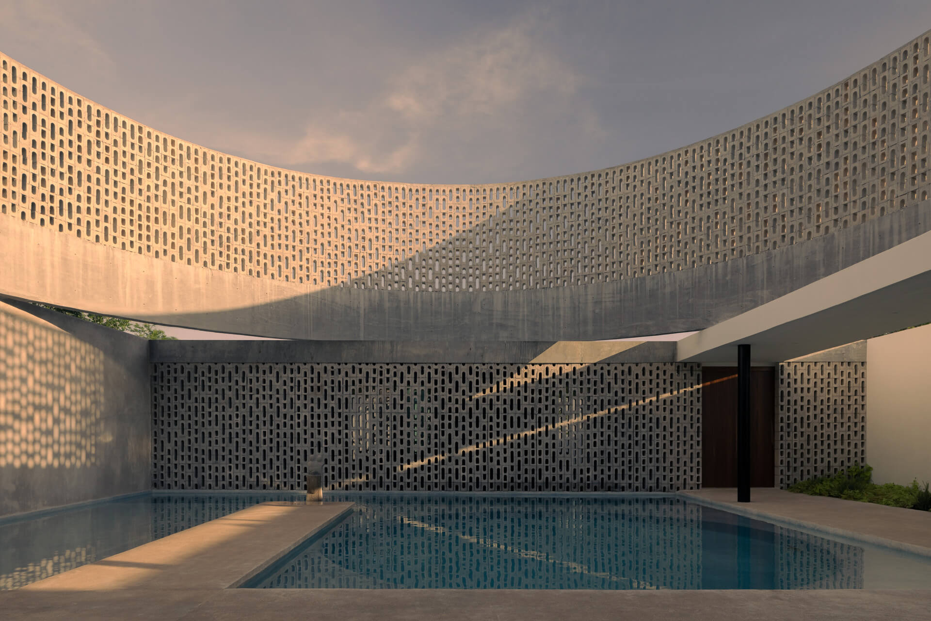 Casting simplicity with concrete, Wóolis is an austere Mexican architecture designed by Arkham Projects, conceived as a circular observatory and dwelling located north of the city of Mérida in Yucatán, Mexico. Channeling a sentimental friendship between natural light and concrete, the geometric, subtle form is inspired from, and pays homage to Mayan heritage, architecture, and culture, evident in details, motifs, and latticed facades that bring alive the residential architecture. Wóolis was lovingly given its name by the workers, or rather, artisans of Mayan descent, who built it painstakingly by hand, giving it life. According to the Mexican architects, its meaning in Mayan is ball, round, circle – referring to the heart of the project, the gorgeous central cylinder they sculpted in concrete.