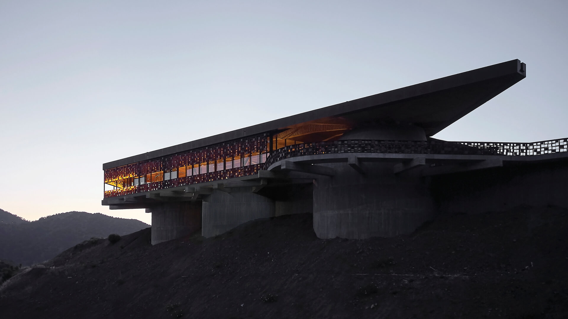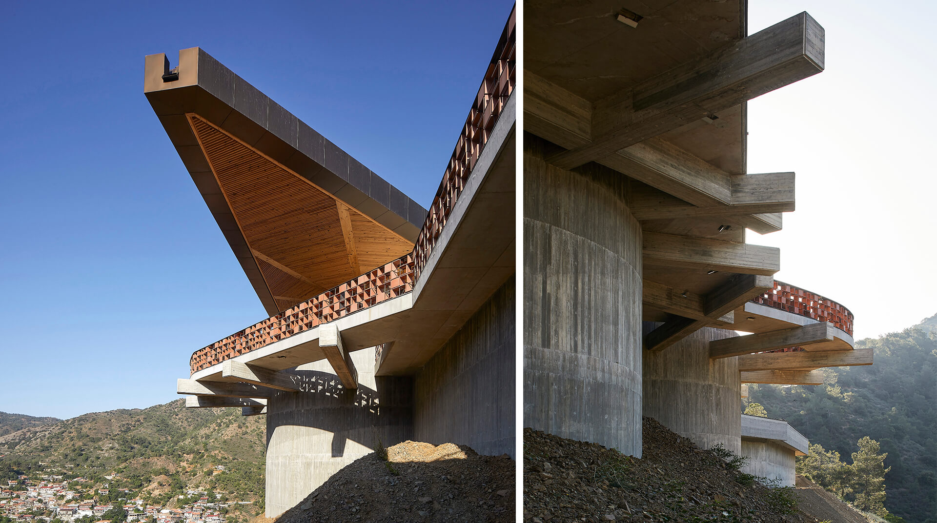Eraclis Papachristou Architects conceived this picturesque wine distillery inspired by the Lampadistis churches in Cyprus, evoking in its splendid form, the drama of brutalism. A wonderful example of béton brut, the winery appears anchored to the hill, preparing to take flight. The form unwinds in three layers— a bulky substructure, and an angular superstructure, with a concrete roof and perforated façade. While the architects mention the influence of the Lampadistis in the contextual architecture, the physical manifestation of this influence can be seen in the three cylindrical structures visible in the form, which also represent the three main stages of winemaking— fermentation, ageing, and bottling.