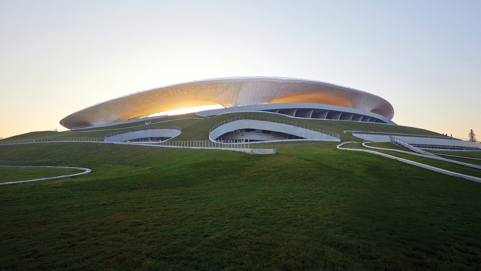 MAD Architects led by Ma Yansong conceived the first completed public building of the Quzhou Sports Park in China as constructed nature and a "piece of land art", made largely of concrete. The Chinese architects describe the site where the sci-fi-inspired stadium design was unveiled—"Quzhou is a historic city 400 kilometres southwest of Shanghai and surrounded by dense forests to the east and west. Its sinuous exterior profile reflects the mountain ridge within distant view of the site while its landscape evokes those of planets imagined by visionary science fiction authors." The sports architecture emerges sans boundaries between its built layers and the surrounding, volcano-like, natural landscape. The undulant topography also informs the organic shape of the Chinese architecture, appearing as a "halo hovering gently above the landscape" when seen from afar.