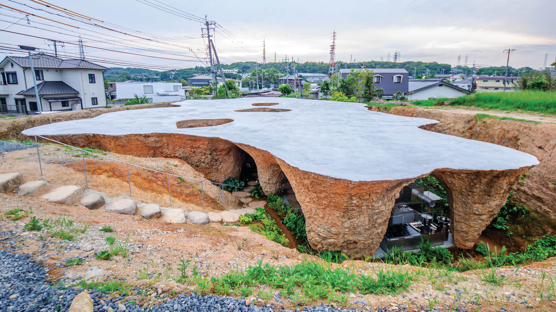 Junya Ishigami, who leads his Tokyo-based practice junya.ishigami + associates, “excavated” a residence and restaurant from the earth in the city of Ube, within Japan’s Yamaguchi Prefecture for this hospitality architecture. A cave-like building, with raw, unpolished finishes across its organic structural members, the hospitality design was realised for chef Motonori Hirata, who implored the Japanese architect to create something that would radiate heaviness and resilience. In fact, the Japanese architecture was not built "on" the site but rather, “carved” out of the terrain and soil layers beneath it, through a process that involved pile driving, concrete filling, and excavation. “More specifically, we dug a hole in the ground to pour concrete, excavated the volume, and fixed glass to create interior spaces,” Ishigami states.