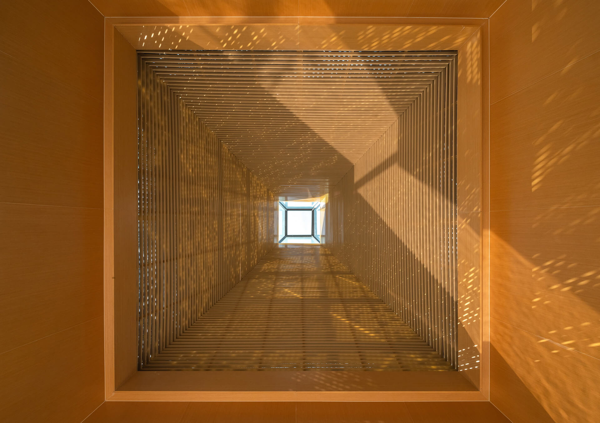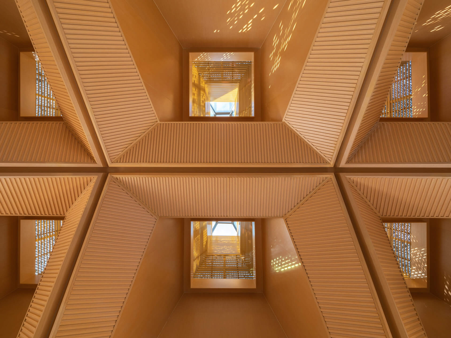 The strategised design of the canopy reaches an overall height of 12 metres, where each pyramidal frustum is topped by a glass-enclosed skylight, channelling natural light into the structure, albeit moderately. The roof system is divided into three layers - customised perforated aluminium panels as the outer layer, with textures created as the layering tops of the metasequoia trees; glass as the middle layer introducing greater luminosity and visual openness; and grilled, warm wooden panels making up the innermost, robust layer.