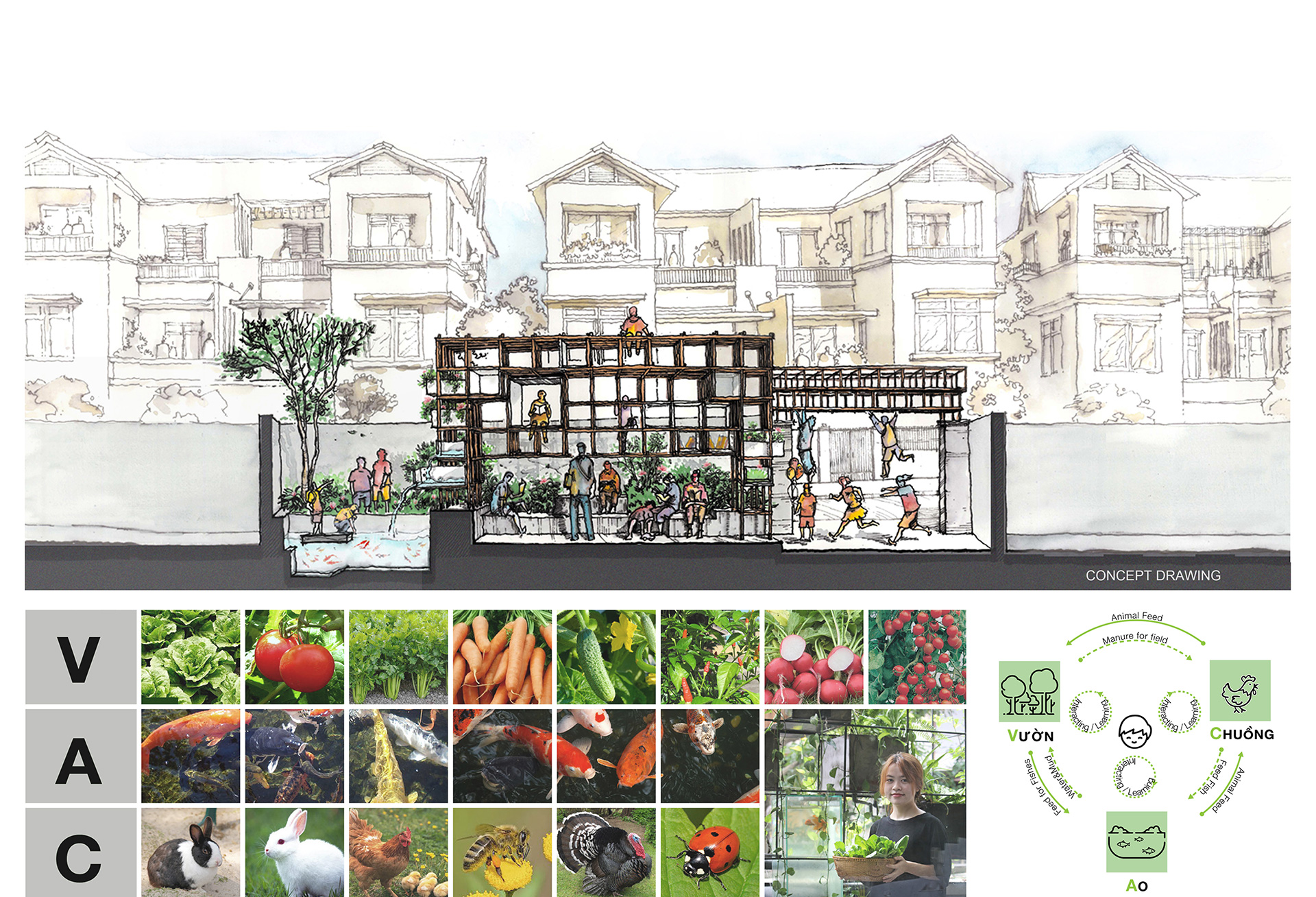 Designed by architect An Viet Dung, the project name is an acronym for Vietnamese phrase - Vuon (garden) Ao (Pond) Chuong (Cage). The core feature for VAC’s design is the use of aquaponics, a technique which combines conventional aquaculture (raising aquatic animals) and hydroponics (cultivating plants in water), to make up an urban farm hybrid.