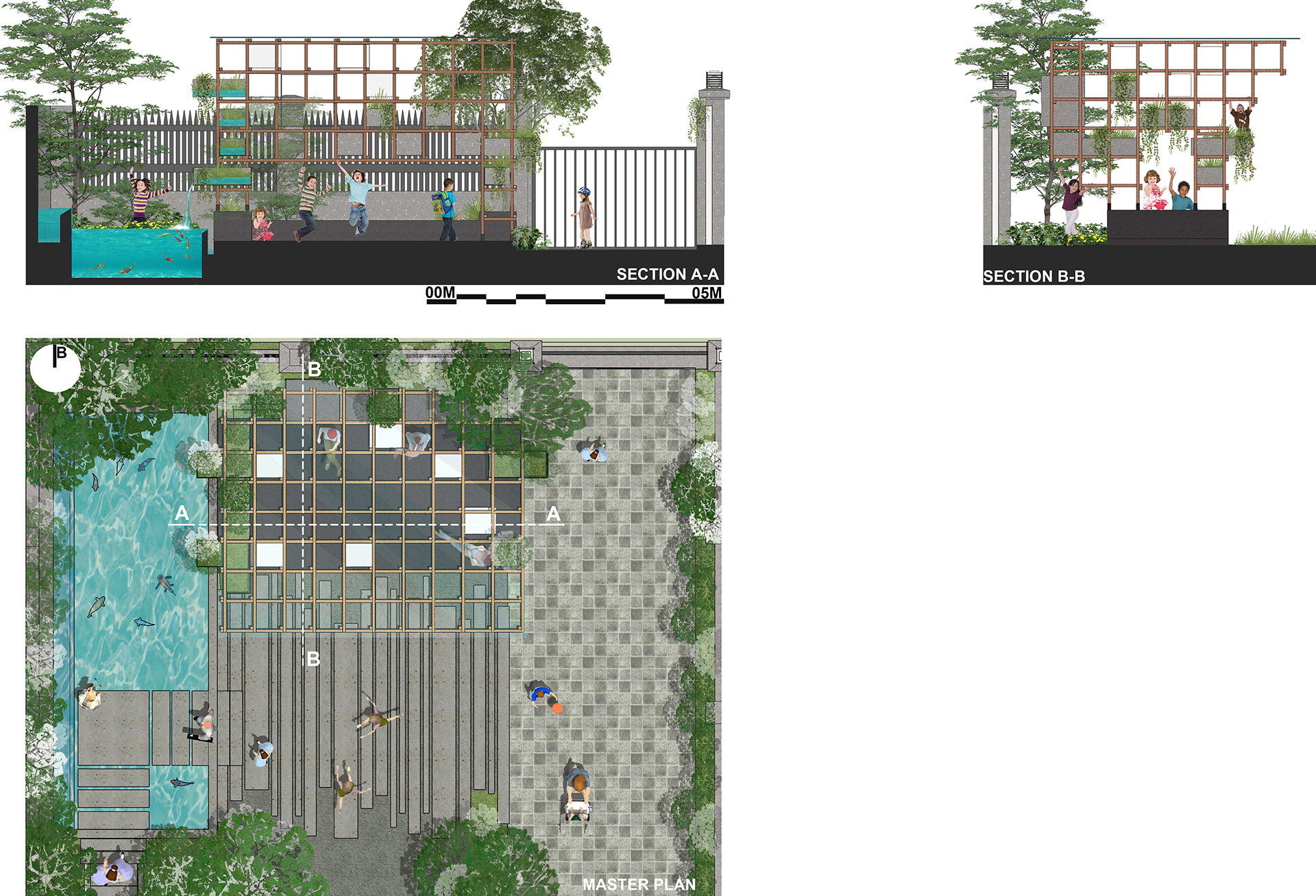 The built space also offers varied seating choices. The gap between the criss-cross frames let children climb to take their seats. A quaint little stone plaza slightly raised above the ground sits at the heart of the space while fixed concrete seating supporting the bottom of the wooden grid surrounds it.