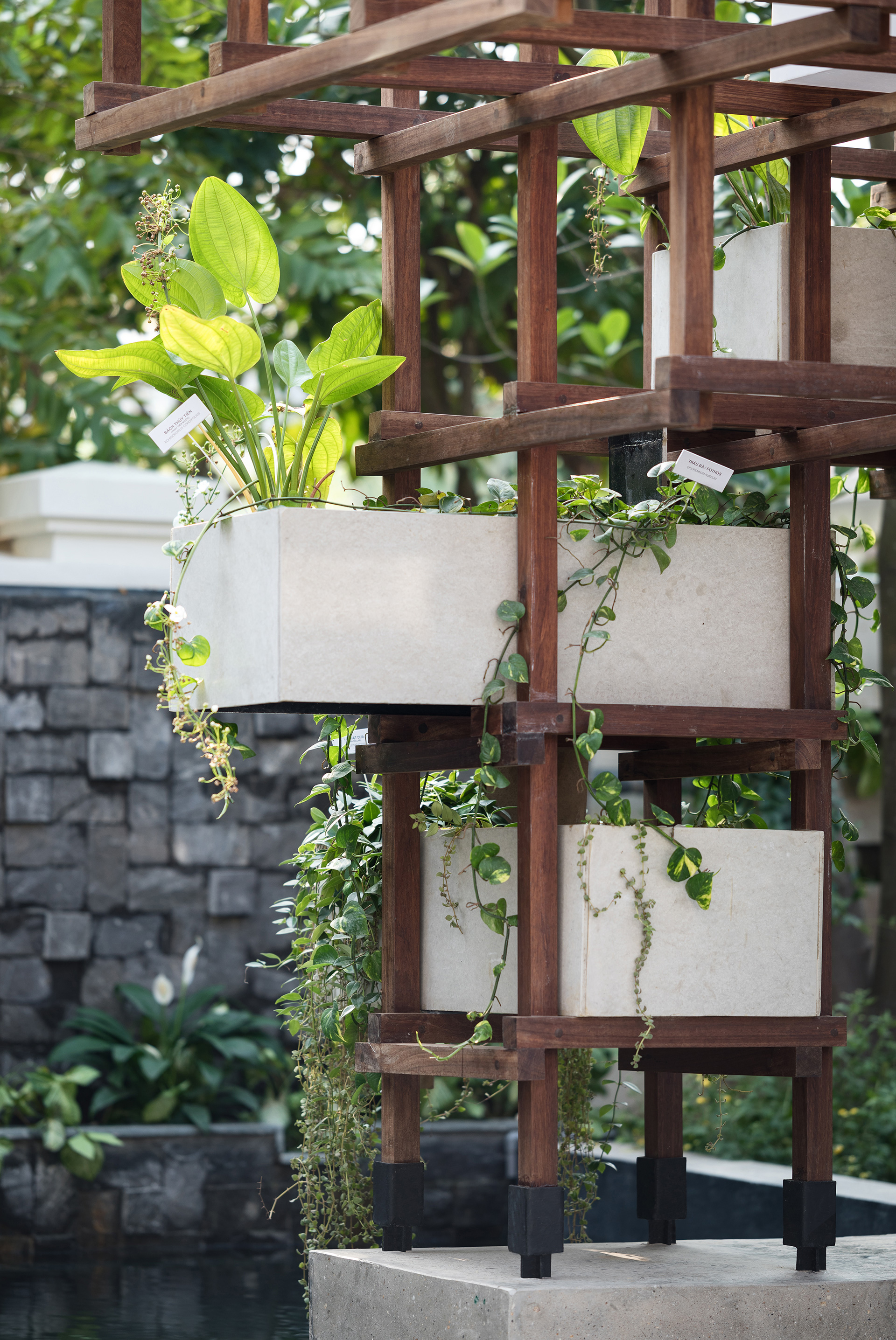 The 55 sqm space features a modular wooden grid next to a pond with the brightly coloured and Vietnam’s favourite, Koi fishes. A series of stone steps connect the built landscape to the water body. The structure, like a DIY assemblage, also works as a space organiser with flexible applications that include seating, storage, lighting and a solar panel integrated roof.