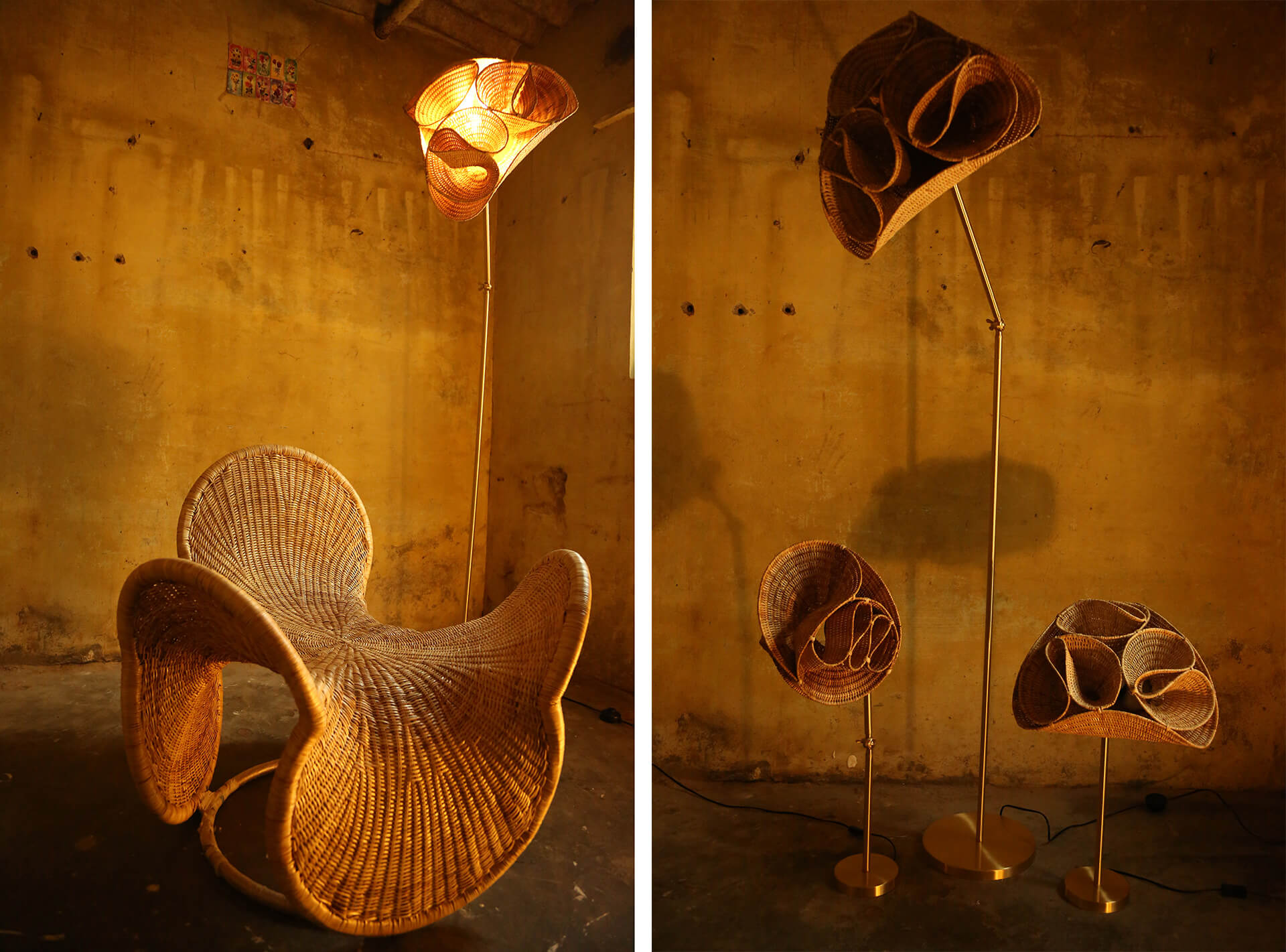 One of the newest products is the Coral series, which features a chair and a lamp. Here the design moves away from the idea of a skeletal structure supporting the woven skin. Instead, it utilises a flat woven mat that is then moulded into a three-dimensional object. It is another chapter in the evolution of the studio’s story. Taking into consideration the transportability of the products themselves, the Coral series is designed to assist in flat-pack delivery. The undulation form, however, is not sacrificed, it is an interesting development in the direction of merging craft and parametric design.