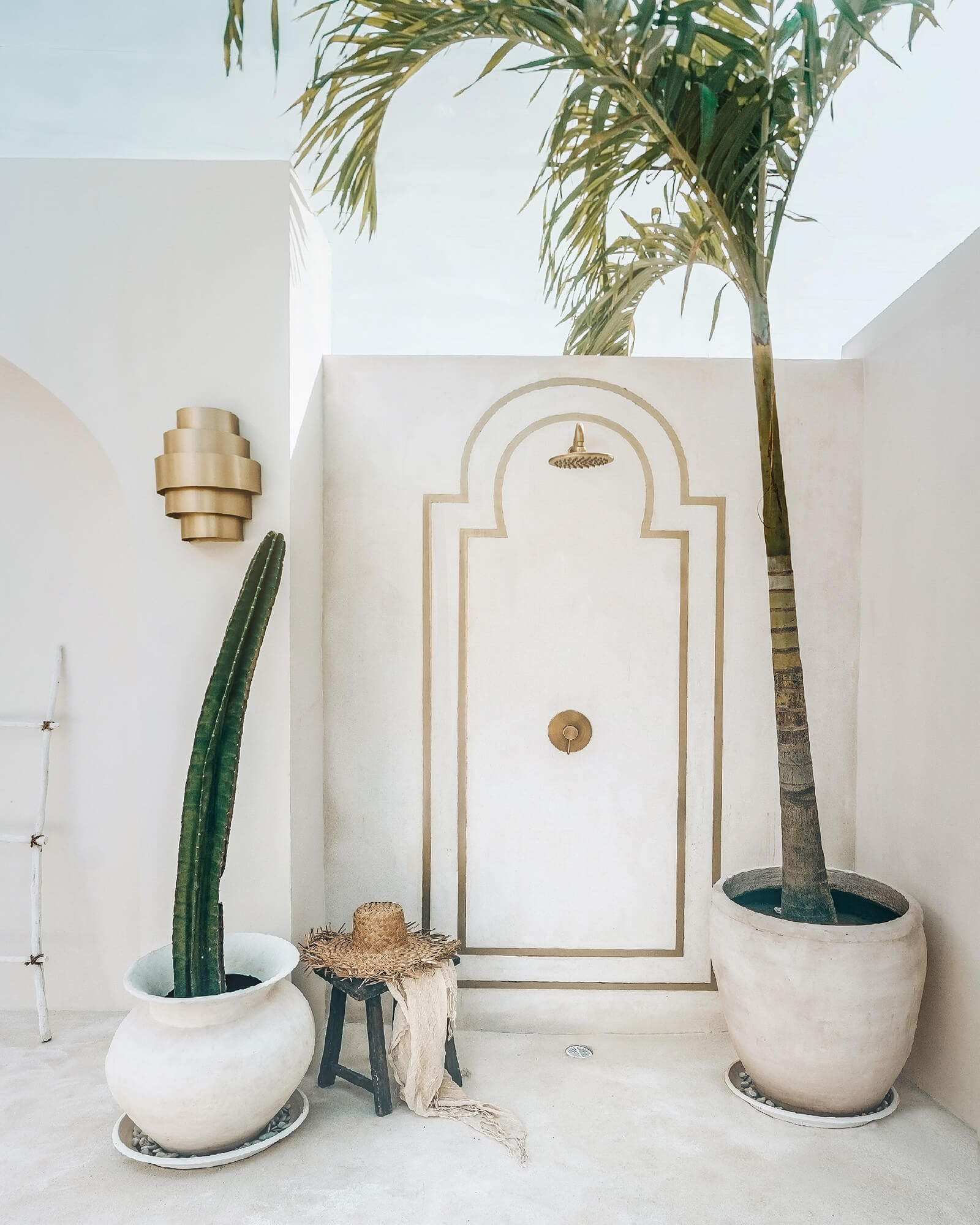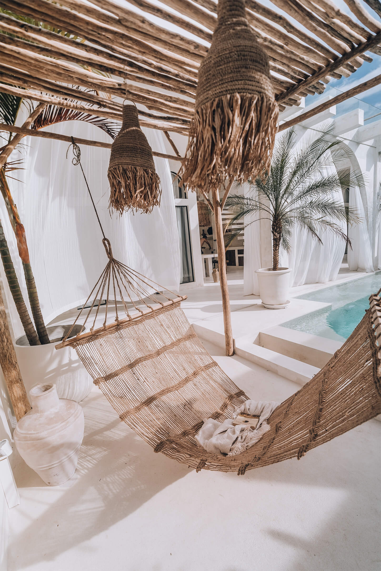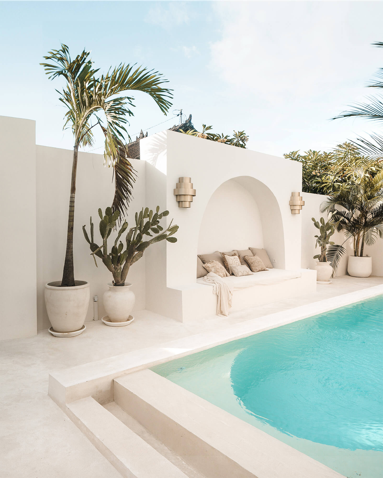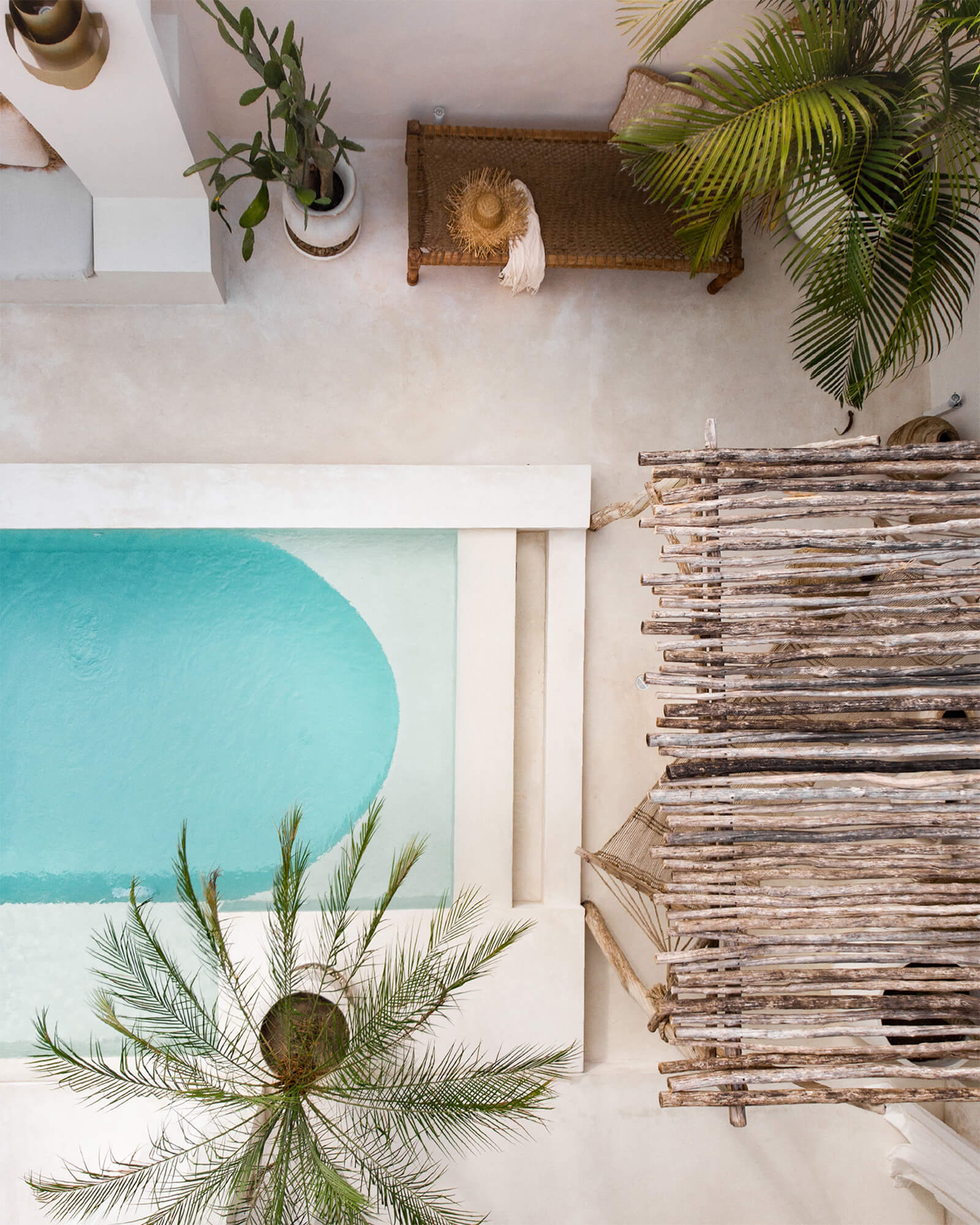 Casa Nomada Bali’s bedrooms and bathrooms exhibit the same Mediterranean design aesthetic as the rest of the villa. In addition, the outdoor pool with a shower, gold accents and plants, particularly stands out. At one of the ends of the pool is a bamboo covered terrace with a hammock. “We enjoyed designing the outdoor pool the most, because we wanted to give the visitor the impression of entering a luxurious Roman bath,” state the designers.