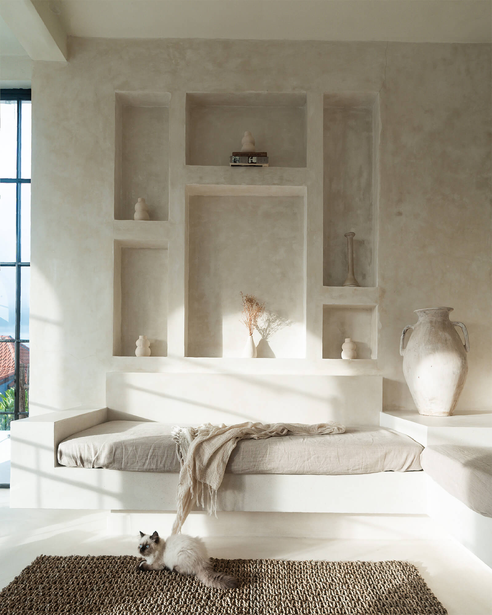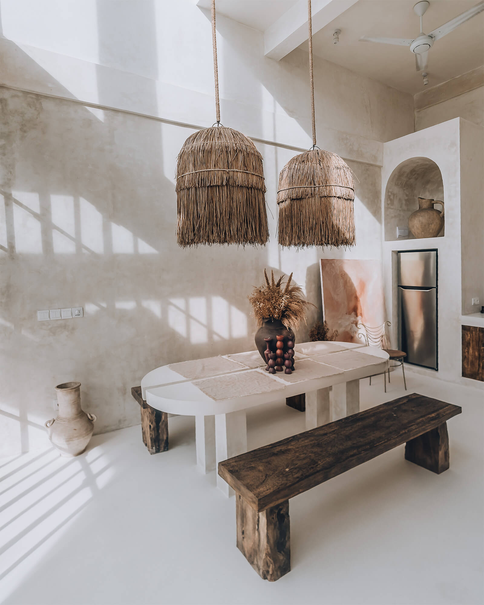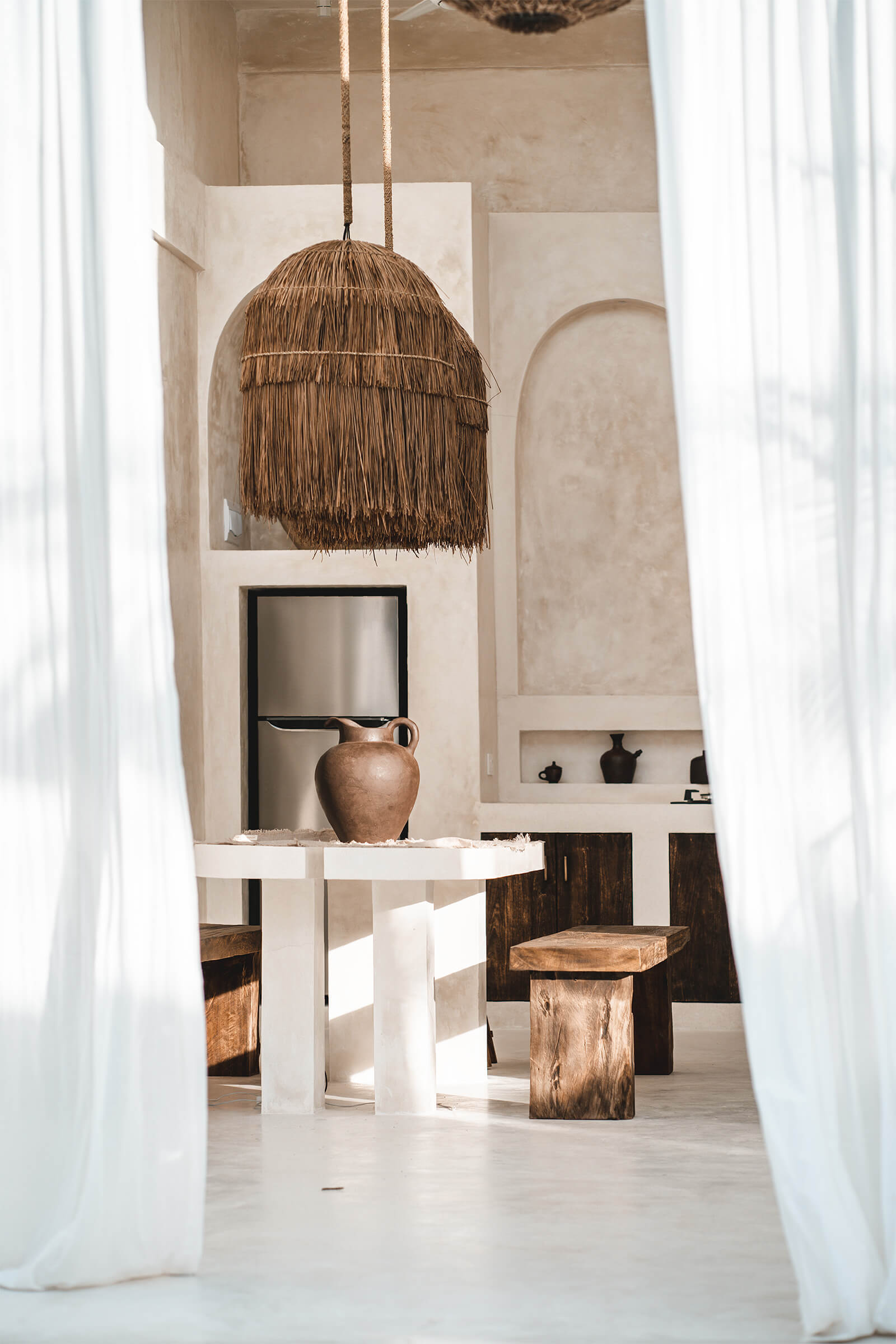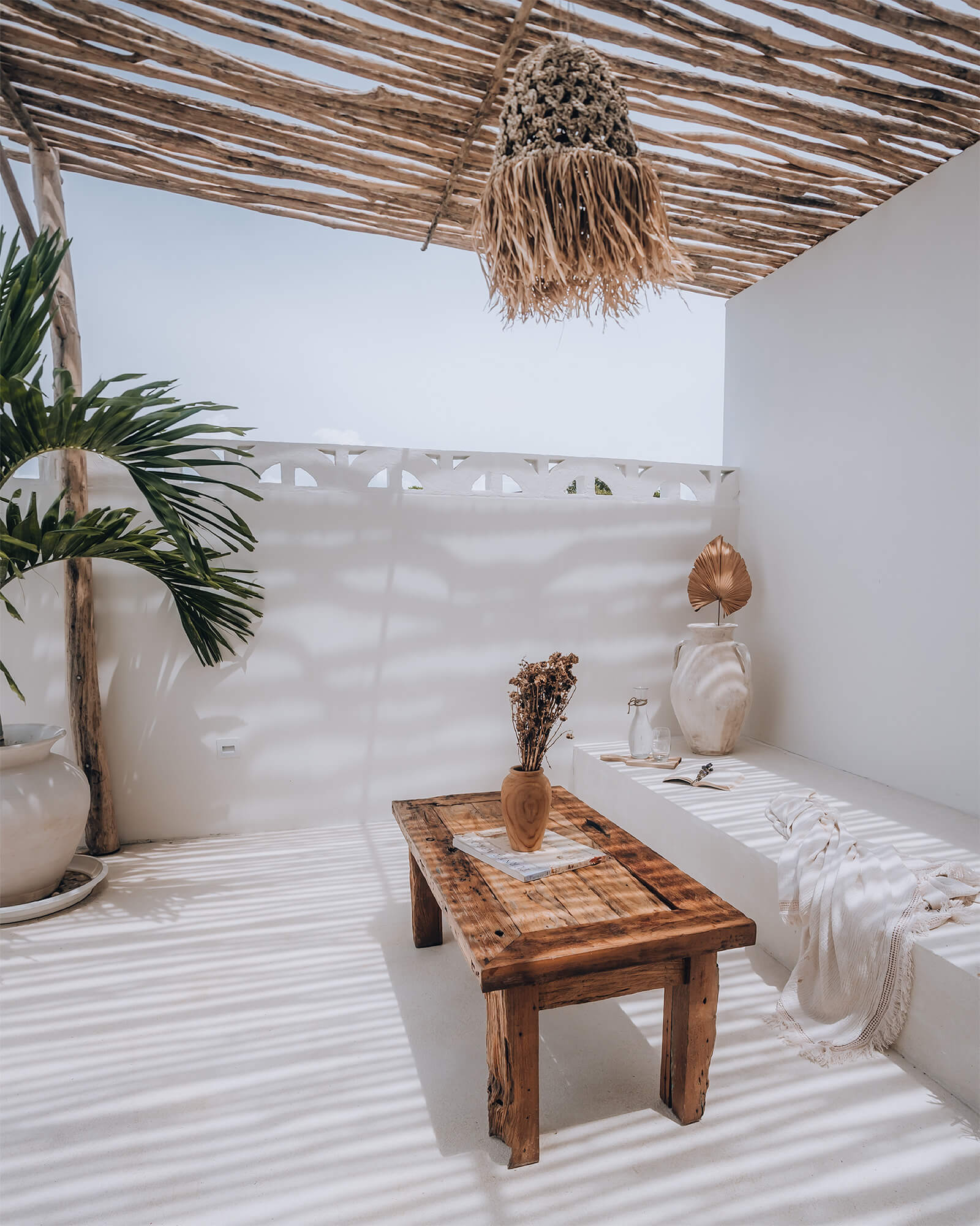 Calle Crespo and Haberberger’s design philosophy is rooted in creating aesthetically pleasing spaces inspired by minimalism, clean lines and a monochromatic palette. While conceptualising the villa, as they are avid photographers themselves, the designers kept in mind things such as the play of natural light and shadows, and the importance of simple backdrops. They were inspired by geometric shapes, contrasting textures, Mediterranean architecture and biophilic design. The minimalist interiors are beneficial for shoots as they can be interpreted and used in various ways. “From its aesthetic white textured walls, elegant earth-coloured decorations with antique accents, to its dreamy pool, Casa Nomada will transport you to Santorini, Greece. The villa features contemporary colonial architecture, reflected by its defined arches that frame and display its model, and its rustic, luxurious wooden pergolas that cast glorious shades,” adds Haberberger.