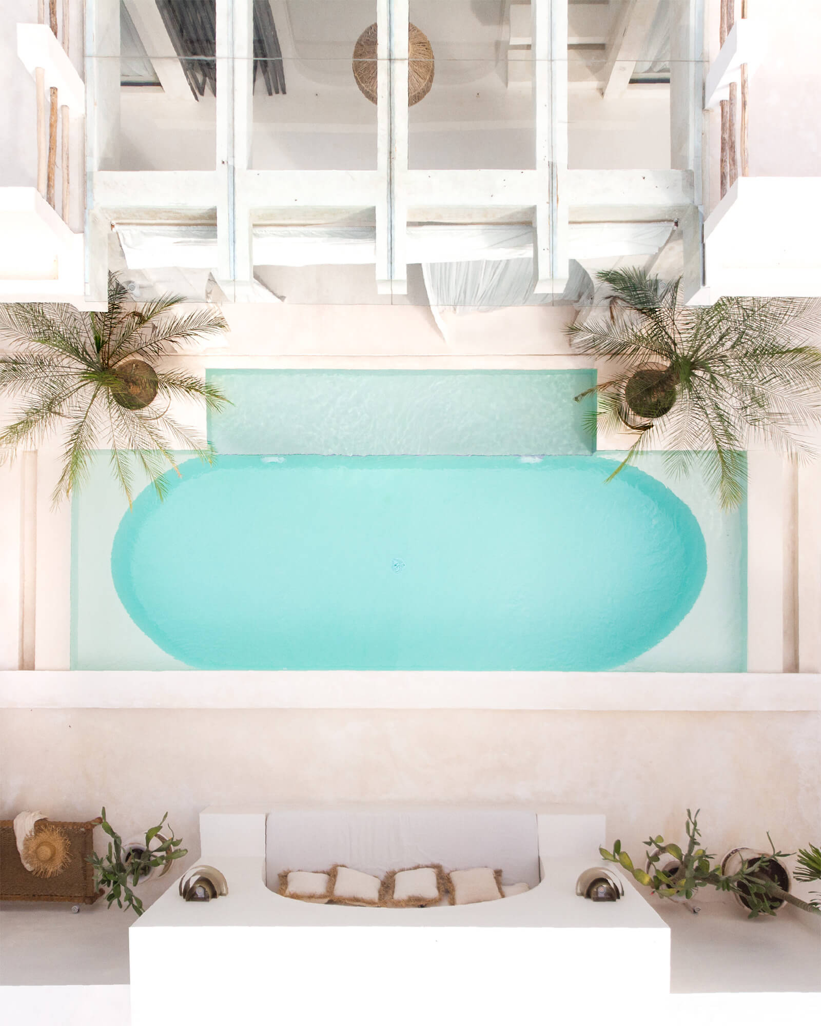 Undoubtedly, Casa Nomada Bali is a celebration of the Mediterranean design aesthetic. The Mediterranean style in interiors is characterised by the design aesthetics of southern European countries. Think light and warm tones in colour scheme, as well as the extensive use of natural materials such as wood, wicker and cotton. “For this villa, we used contemporary white concrete combined with terrazzo mixed with Mediterranean patterns and rustic furniture because we love the harmony and atmosphere created by these components,” add Crespo and Haberberger.