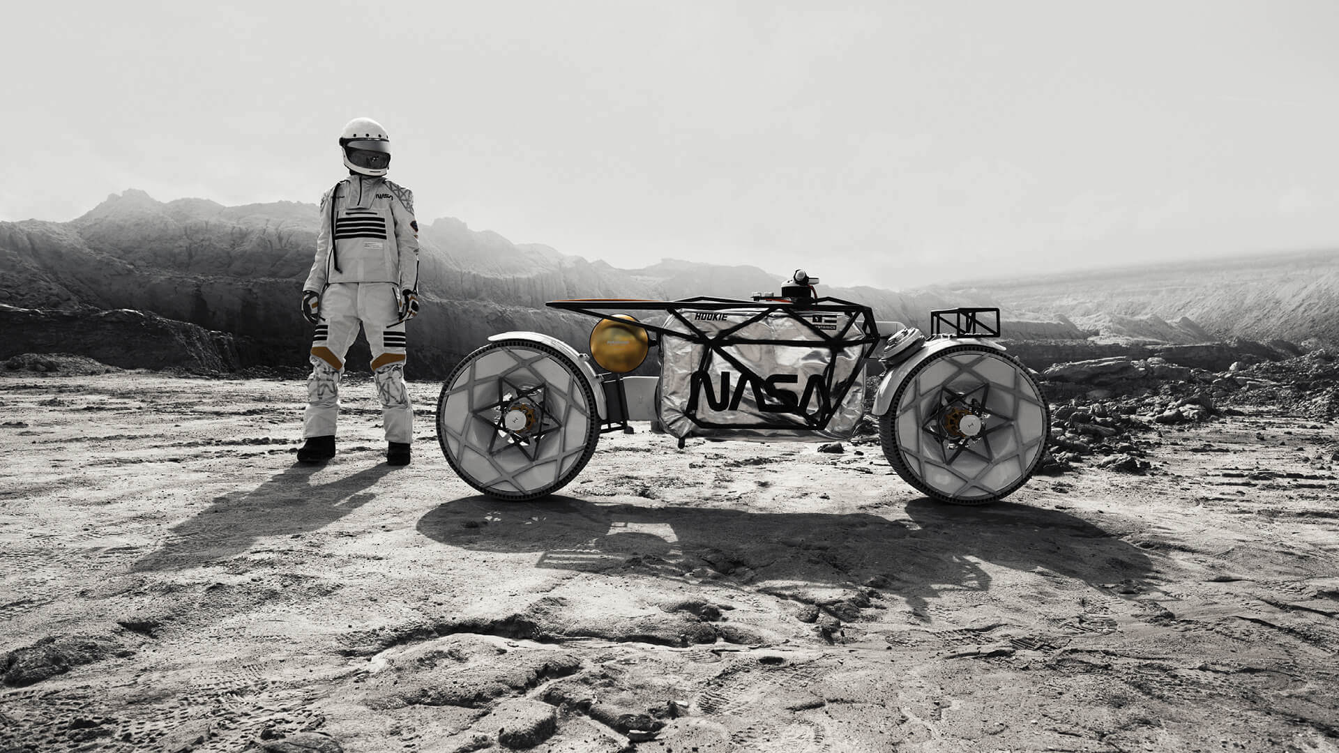 Hookie, a motorcycle design company based in Dresden, Germany, has developed a prototype for a two-wheeled lunar exploration vehicle dubbed Tardigrade. Inspired by the digital artwork of Russian artist Andrew Fabishevskiy, Sylvia and Nico Müller, the Co-Founders of Hookie, came up with a thought experiment for a two-wheeled lunar rover, which, over a period of nine months, morphed into Tardigrade. Named for a microscopic life form capable of surviving in the extreme conditions of outer space, the vehicle references space design, particularly satellites, space stations, and orbital vehicles, both from science fiction and reality. Composed of an extremely slim frame of laser cut aluminium with innovative balloon wheels, airless tires, and rims that have been 3D-printed from UV-resistant thermoplastics, the automobile design project is the result of collaboration, technology, and sustainability, bound by the spirit of adventure and innovation.
