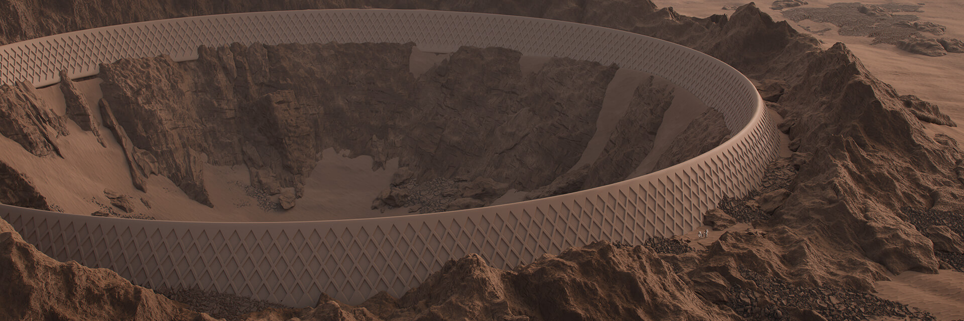 Nüwa City is a proposal for the first self-sustaining Martian settlement, as part of a planet-wide urban architectural development conceptualised by ABIBOO Studio alongside an international team of scientists from the SONet network. The scheme posits housing for five cities, 200,000 - 250,000 each, with Nüwa as the nexus and capital. Structures constituting the settlement are envisioned to be embedded into the surfaces of natural cliffs, with much of the functional areas being placed within excavated rock formations, and vertically bound together by high-speed elevator systems - much like conventional skyscrapers. Sustainability was a core concern throughout the design process, considering the depletion of resources and diminishing environment quality on planet Earth as a result of conventional building methods. Hence, the design team implemented measures such as reusing the soil obtained from cliff excavations, as a buffer layer above the roof structures at ground level to mitigate the threat of excessive radiation exposure. Modularity and flexibility were also of paramount importance, with the urban design proposal's 10 m x 60 m tubular modules designed to adaptively connect as and when needed.