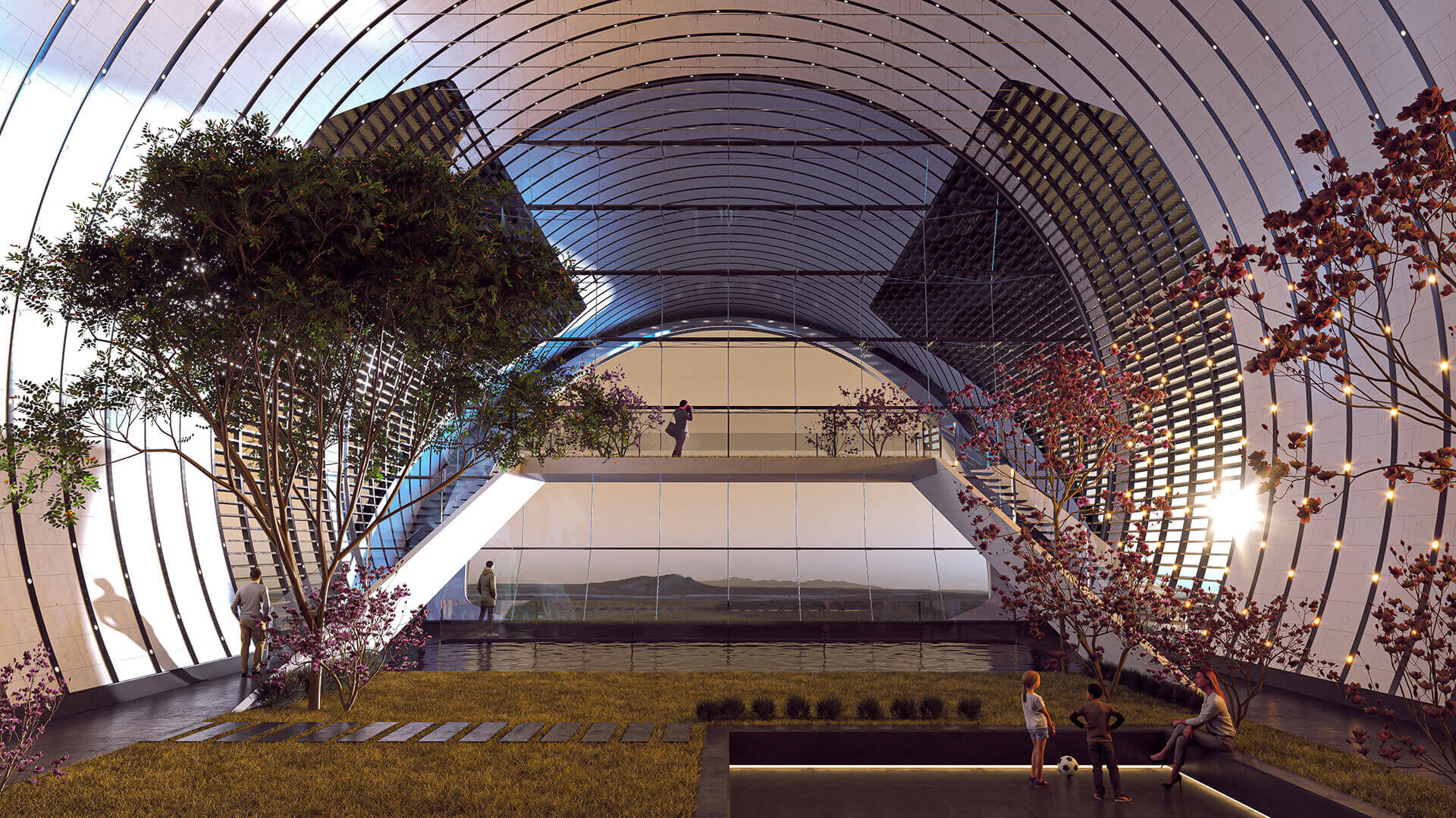 Ukraine-based practice Makhno Studio has imagined a self-sustaining settlement along the insides of a crater near Mars’ equator. The concept for a self-contained type of Martian architecture, named ‘Plan C.’ is designed to be assembled using large-scale 3D-printing on a partially terraformed Martian surface, at a point in the future where humanity possesses the technology to process the red planet’s resources, eliminate residual surface radiation and extract sufficient oxygen and water to produce food and sustain life. Composed of a torus-shaped form with a grand public hall extending throughout most of its interior, the concept contains a medical centre, an isolation ward, an atmosphere monitoring research centre, chemical and biological laboratories, a control area, and an administrative block, alongside spherical greenhouses for food production, residential quarters, and extensive landscape design elements.