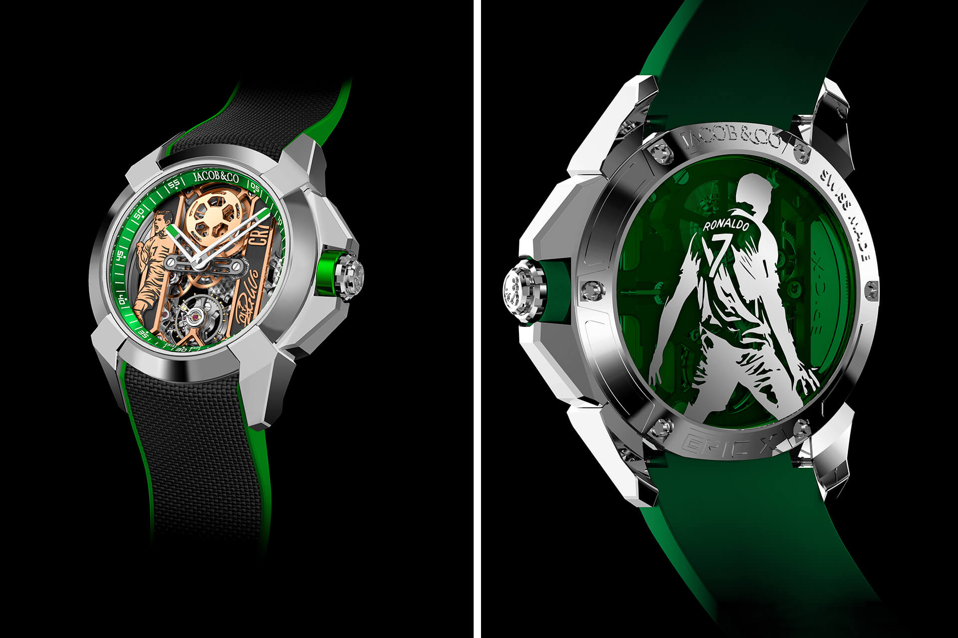 The watches are designed in vivid shades of red and green that beautifully pay homage to the primary colours of the Portuguese flag. The Flight of CR7 version is rendered in a subtle shade of red with the lugs, case and bezel in a smooth rose gold finish and also with a bezel set of 26 baguette-cut white diamonds. The case back for both renditions of the Flight for CR7 watch displays a red mineral crystal with a gold print of the five times Ballon d’Or winner’s celebratory ‘siu’ move. The strap is finished in a black Cordura strap and a red lining on an 18k rose gold buckle. The second watch from the much-fabled series is in an opulent shade of green with structural elements in stainless steel. Just like the first watch, the case back of the Heart of CR7 watch has a similar look designed with the contrasting green mineral crystal and a silver print of Ronaldo’s lively move. The strap for the watch is in a green honeycomb rubber strap on a stainless steel pin buckle.