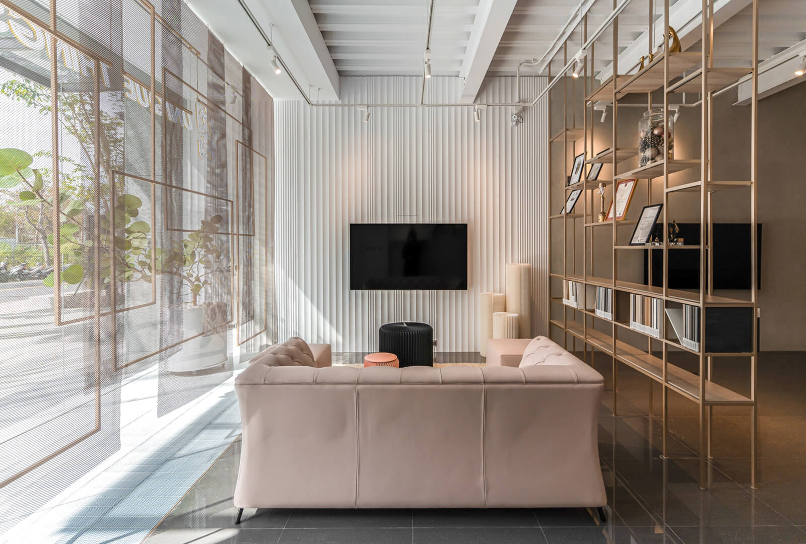 An aesthetic feast that strove to embody the aesthetic of light luxury, LIFE FLOW by Shun-Yuan Chang of Chung Yuan Christian University in Taiwan is a workspace design project that deconstructs elements of meeting areas to recreate the luxury of a boutique space. Pervaded by an air of delicacy, with a sophisticated, cosy atmosphere, the space features an intriguing play between its distinctive shelving, geometric design elements, and the linear lighting units suspended between beams running across its ceiling.