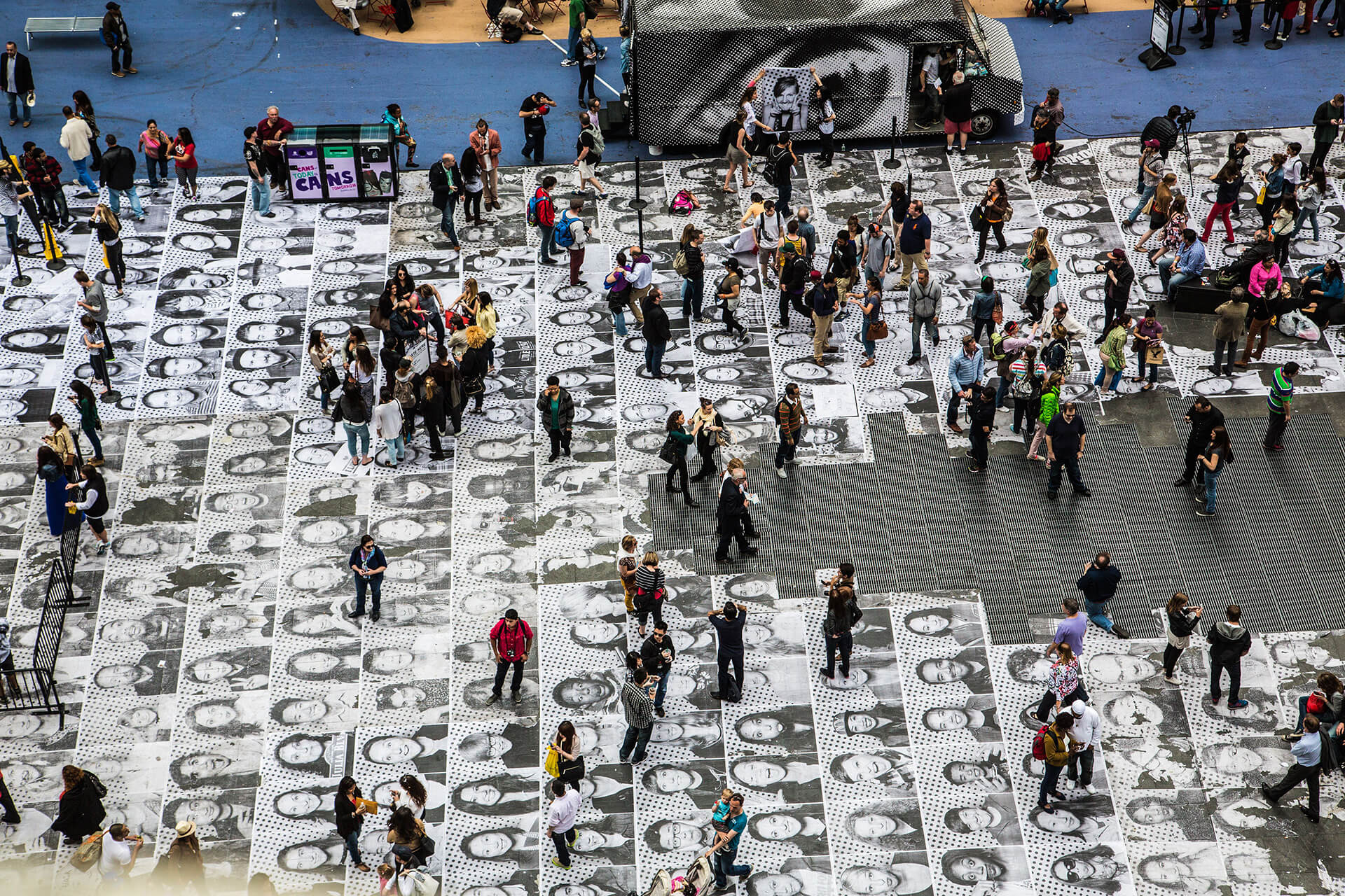 Sectioned in separate rooms, the exhibition showcases Inside Out, one of the largest interactive art projects in the exhibition's last room. Since its inception in 2011, over 400,000 people from around 140 nations have taken part in this project. The project encourages initiatives by private citizens and institutions to bring their problems to the attention of the public. As part of the exhibition, one of JR's Inside Out trucks will be turned into a mobile photo studio and will stop at various spots across Munich in September 2022. All of Munich is cordially invited to participate in the initiative Kunst & Kultur für alle (Art & Culture for Everyone). Their photos will be taken in the truck, printed, and instantly incorporated into the installation.