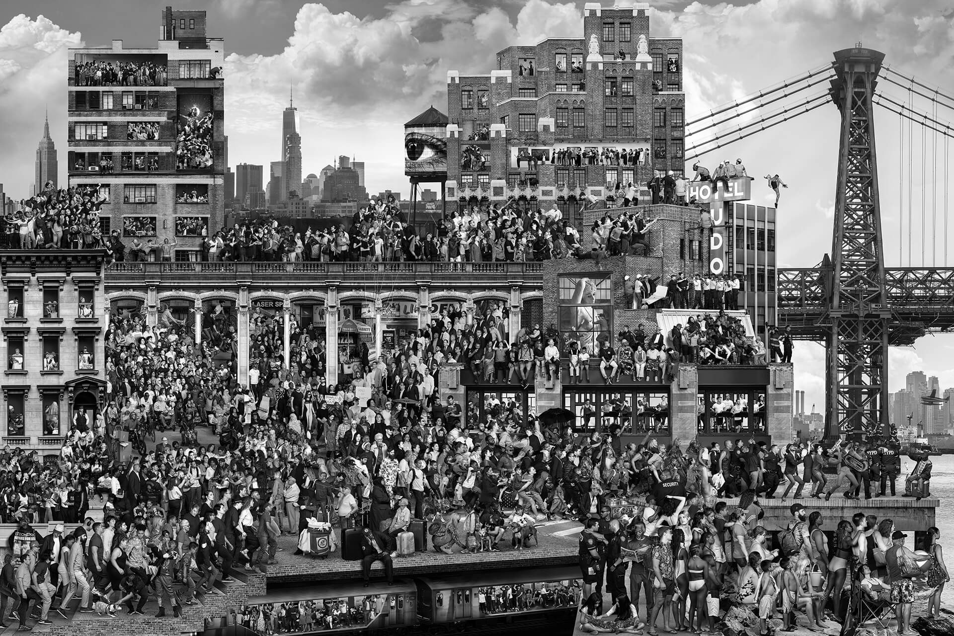 By the mid-2000s, JR broadened his reach with projects all around the world. In 2005, he made his first trip to Israel and Palestine. While there he photographed individuals from both sides of the wall, who happened to work in the same industry. The display of Face2Face placed these photos as pairs, one from Palestine and one from Israel, side by side placing both nations on equal terms. It was the largest illegal picture show to date, with posters on the border wall in Bethlehem, Tel Aviv, and Jerusalem, among other places. As part of, JR: Chronicles the exhibition's primary gallery will see a large photo collage made up of hundreds of images that aim to convey the diverse nature of the individuals who, in all their diversity, make up the complex collective of a neighbourhood or a metropolis.